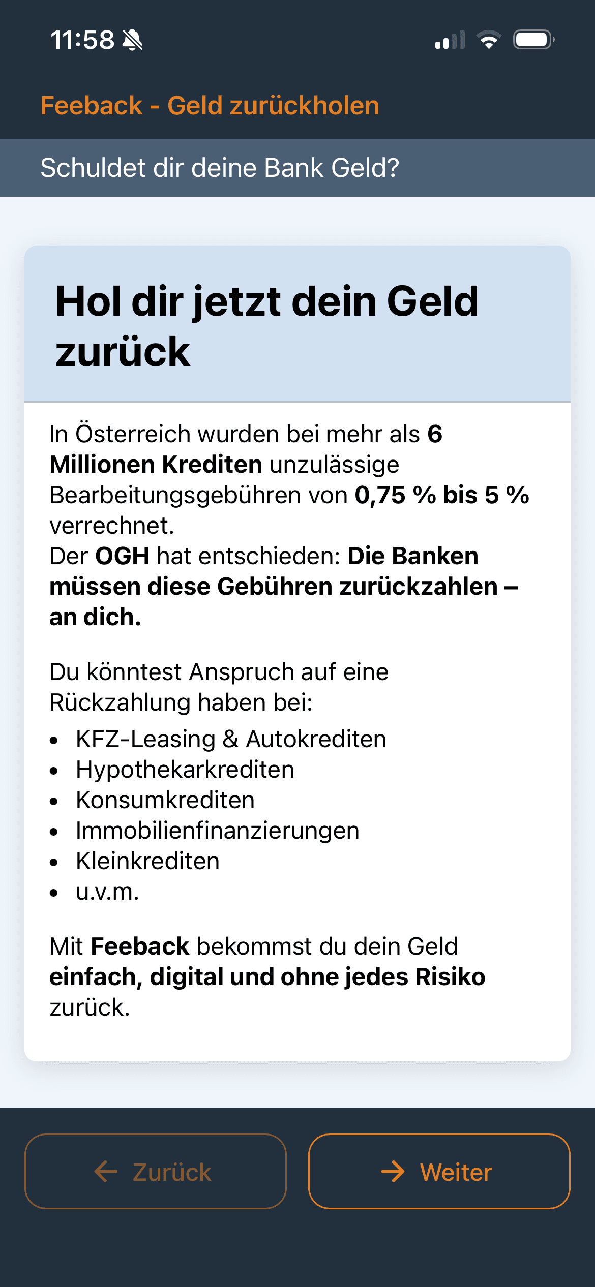 Feeback ist eine App, mit der du prüfen kannst, ob du unzulässige Kreditbearbeitungsgebühren zurückfordern kannst. Der Prozess ist einfach, digital und für dich ohne Risiko.