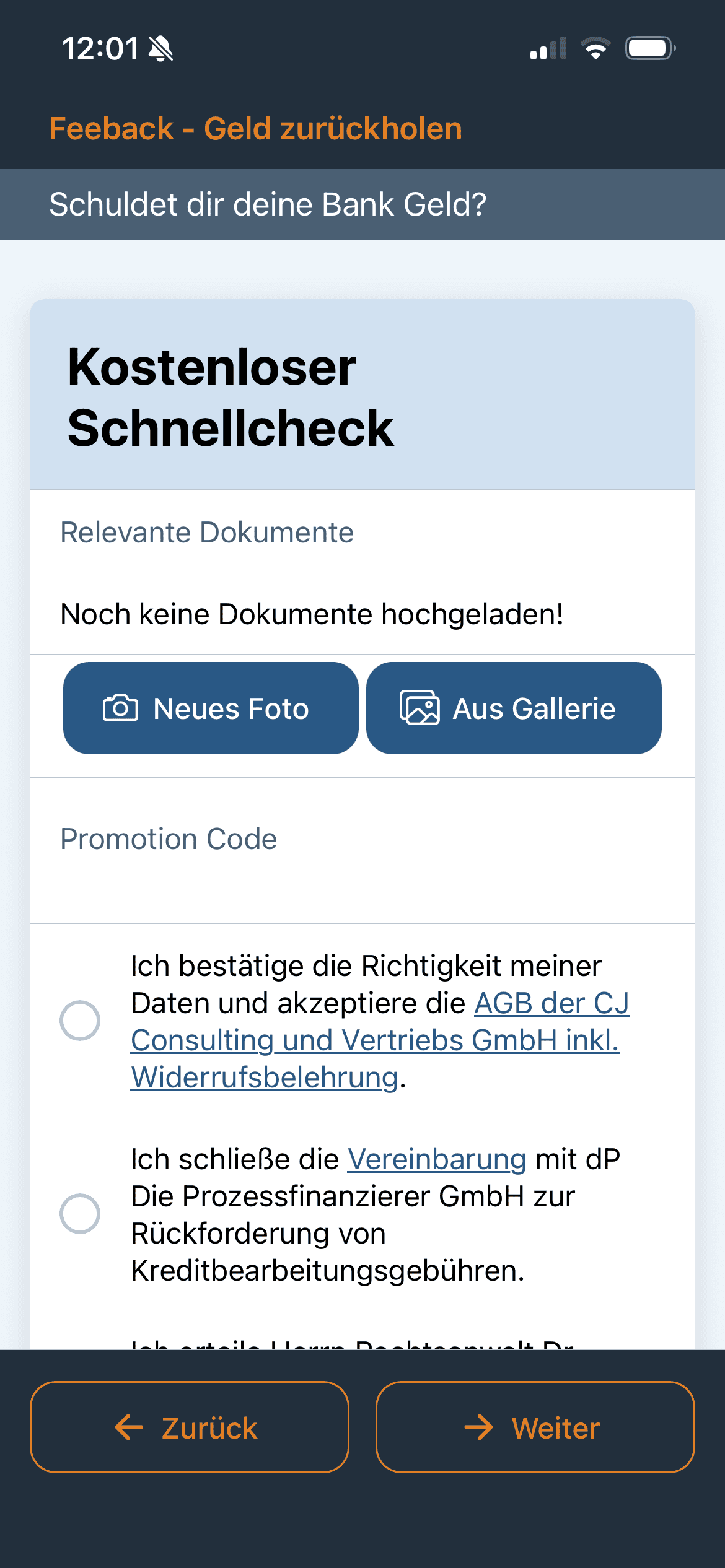 Nein. Alle Kosten übernimmt der Prozessfinanzierer dP. Du zahlst nur dann eine Erfolgsbeteiligung, wenn tatsächlich Geld für dich zurückgeholt wird.