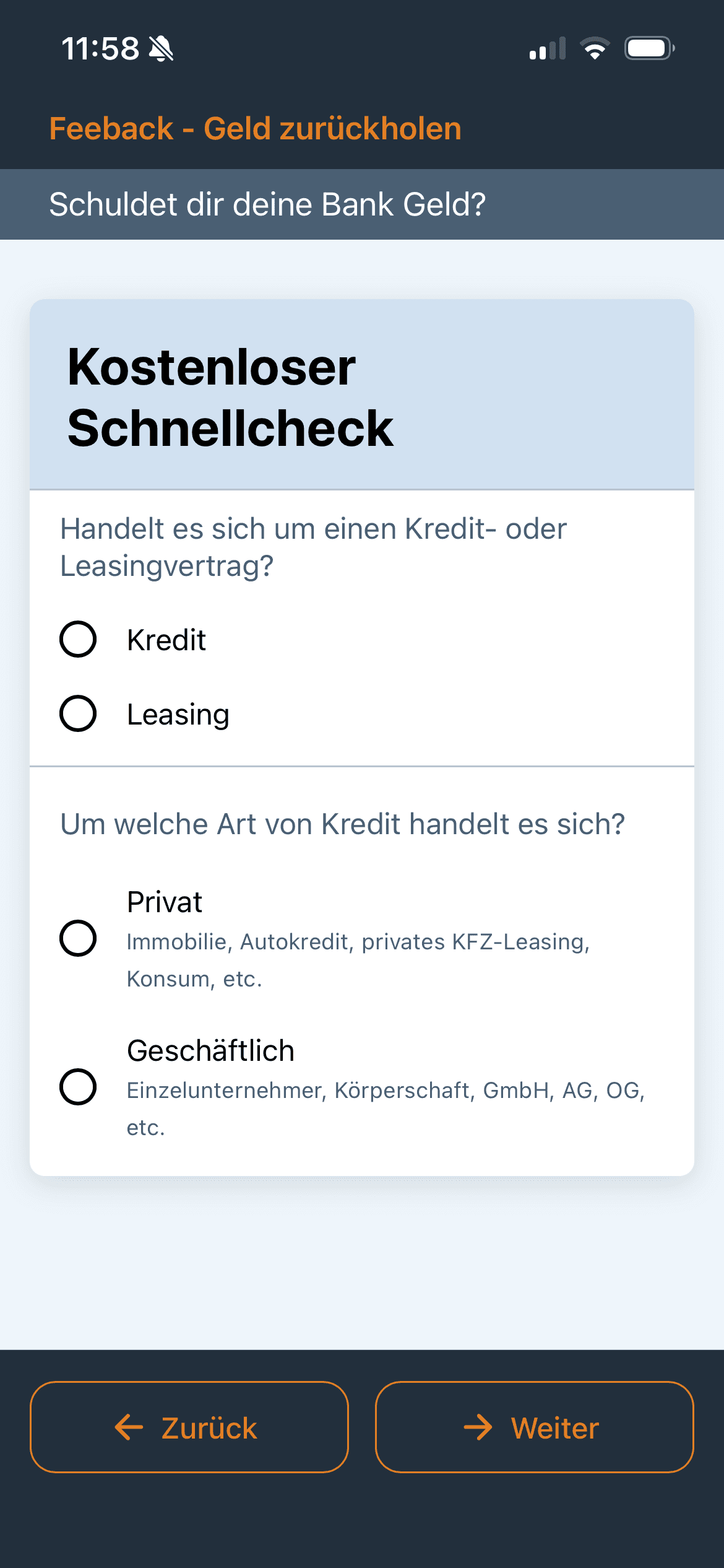 Du beantwortest ein paar kurze Fragen zu deinem Kredit (z. B. Kreditart und Höhe). In weniger als zwei Minuten erfährst du, ob du möglicherweise Anspruch auf eine Rückzahlung hast.